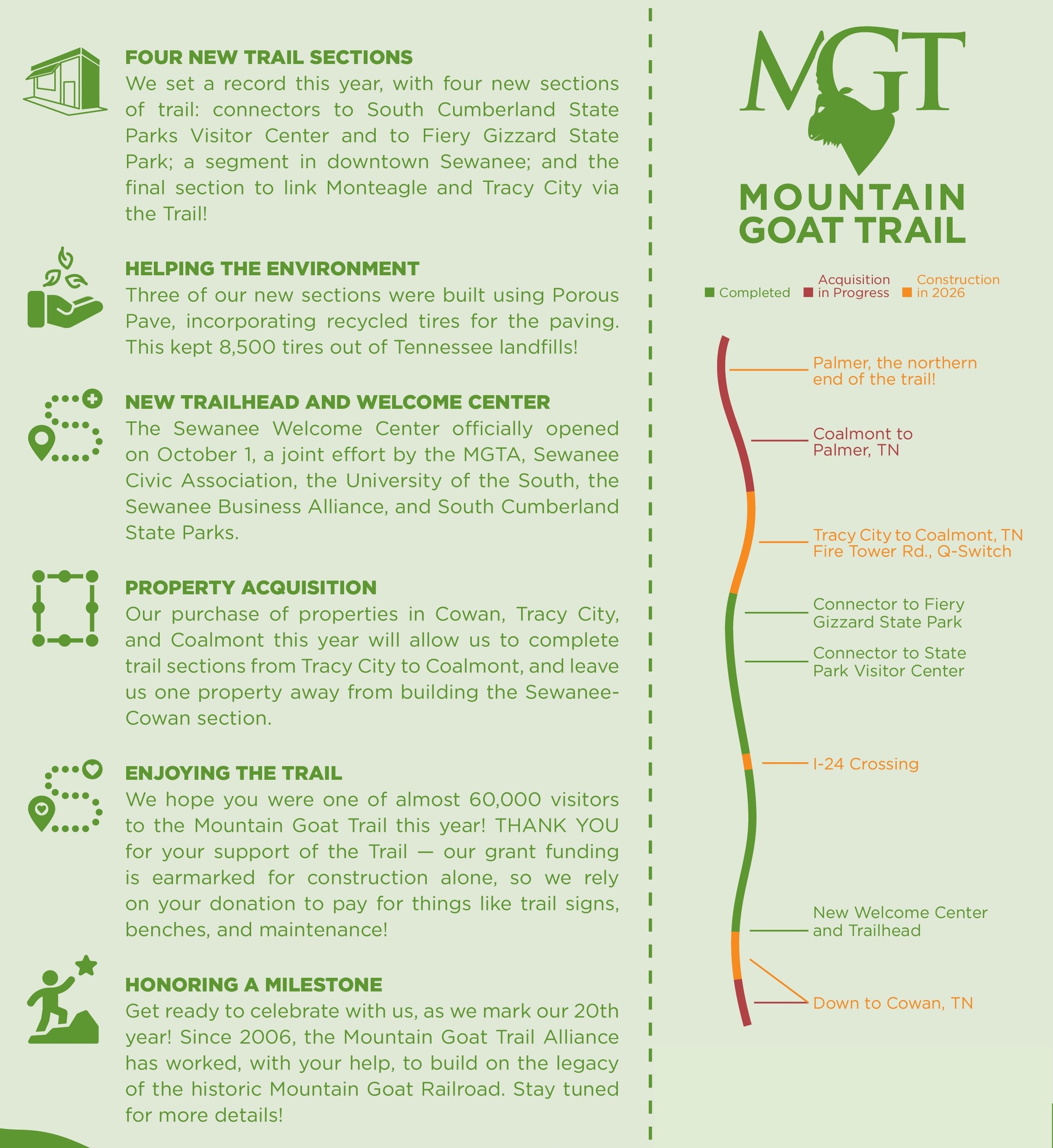 The Mountain Goat Trail Alliance (MGTA) has been awarded a $352,000 grant under the Tire Environmental Act Program (TEAP) by the Tennessee Department of Environment and Conservation. The grant will be used to construct connector trails between the Mountain Goat Trail and the South Cumberland State Park Visitor Center and between the trail and the Fiery Gizzard trailhead in Tracy City.